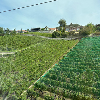 Left: Lake Geneva; middle: Vineyards; right: Close up of how the grapes are protected between screens